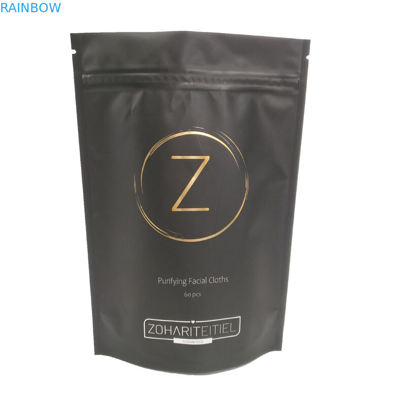 OEM Logo Sac Plastique Black Color avec la tirette pour la poche de empaquetage cosmétique de nettoyage faciale de sac de poche de support de coutume de tissu