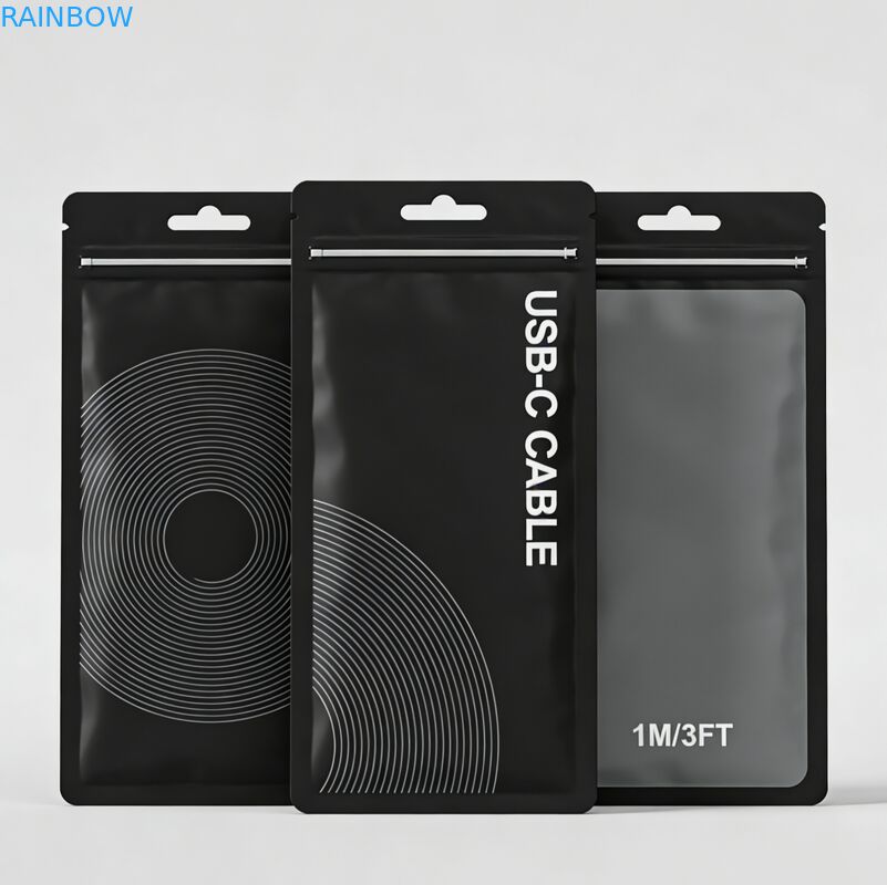 Des sacs d'emballage en plastique mat en PVC imprimé sur mesure de haute qualité, ré-fermées, conçus pour les accessoires de téléphone, les câbles USB, les étuis pour tablettes et divers produits électroniques.Caractéristiques de la construction d'étanchéité à trois côtés pour un emballage sécurisé.